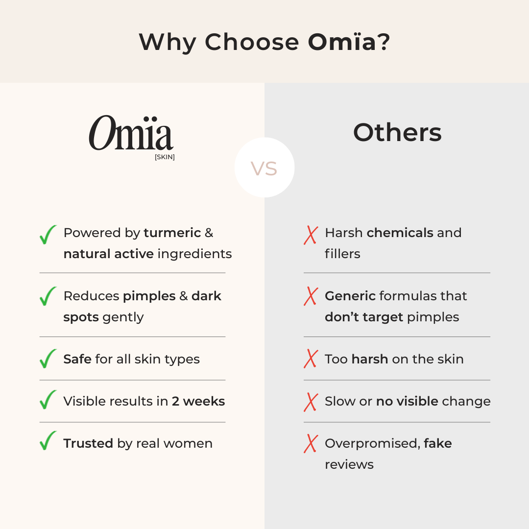 Most products either dry out your skin or feel too gentle to actually work. Omïa is designed to be both effective and soothing. Our hero ingredients, turmeric and kojic acid, help reduce pimples and dark spots. It’s natural, simple, and actually delivers results.